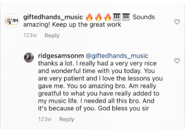 At Gifted Hands Music, we’re confident that your ability to play and understand gospel music will be radically improved in as little as 90 days. If for any reason you don’t believe the content covered has helped you improve as a musician, we guarantee to give you a full refund AND pay for your lessons with one of our competitors.